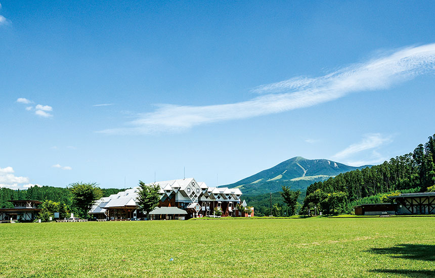 #学びやの里 は広々とした敷地内には、研修宿泊施設「木魂館」やグラウンド、キャンプサイトがあり、さらに地元食材を使ったレストラン「北里バラン」や天然温泉「博士の湯」も併設しています。