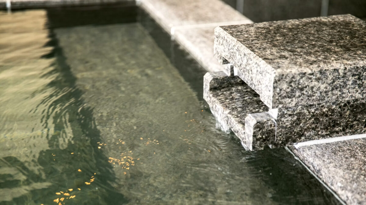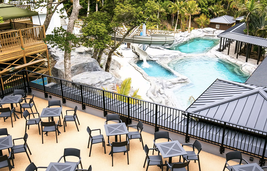渓流が上段から下段に流れてつながるプールとスライダー。