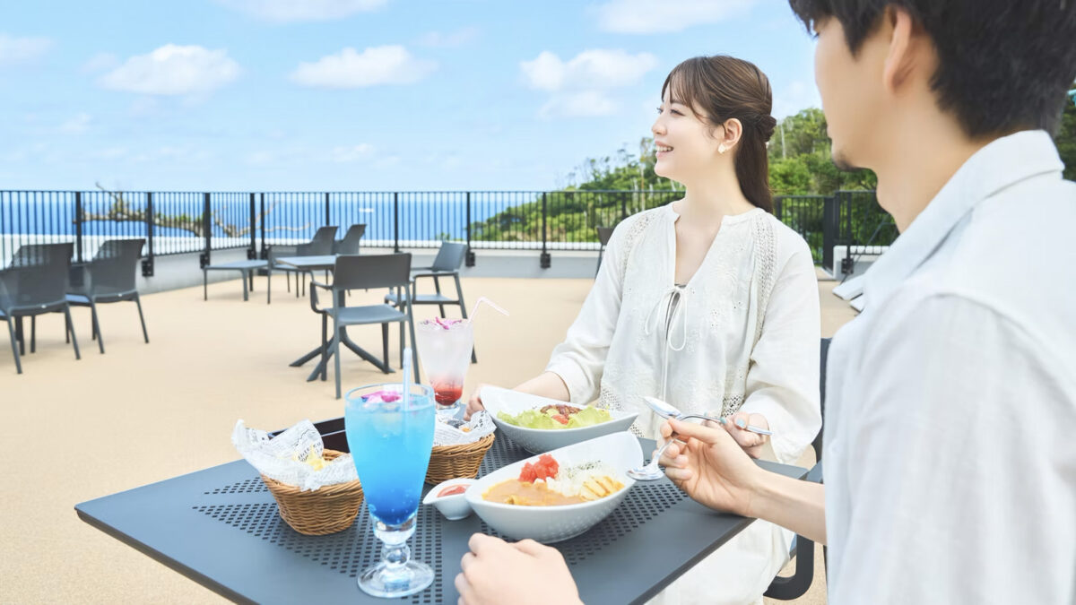 プールサイドや各テラスで絶景を見ながら食事がたのしめる、「奄美温泉 大和」のレストラン&バー。