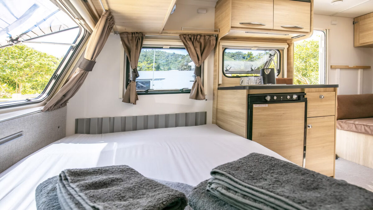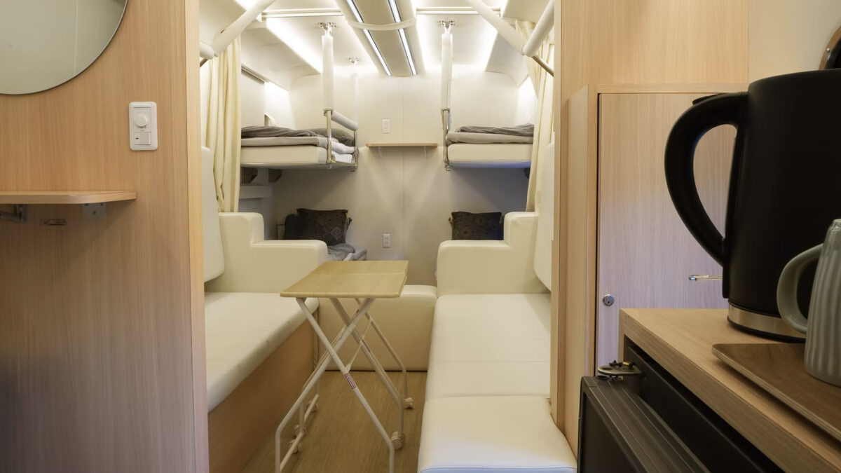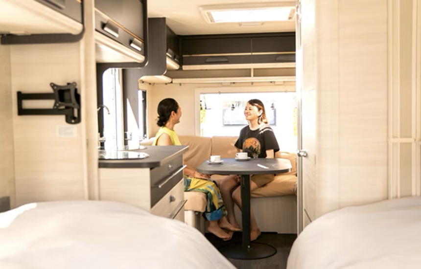 客室トレーラーは、洗練された内装とコンパクトながら最新の設備を備え、快適にご就寝いただけます。