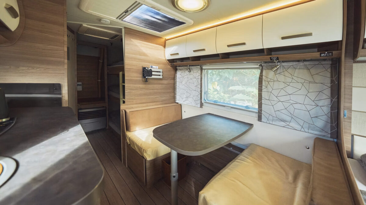 ナチュラルシックなドイツ製の本格トレーラーハウス。3段ベッドが楽しいファミリータイプです。
