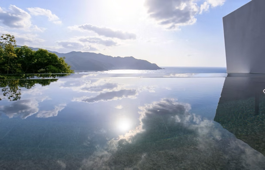 大きく切り開かれた屋根と、水平線にこぼれる水面が、ありのままの自然の魅力を最大限に引き立て、まるで一枚の美しいキャンバスに。