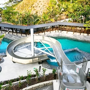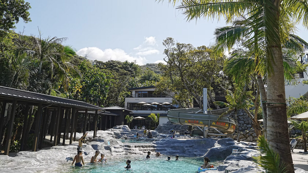 天然地下水を汲み上げた屋外プール兼水風呂にスライダーでダイブするエクストリーム体験は、思い出に残ること確実です。