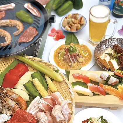 夕暮れ時からのディナータイムは、さざ波のBGMとともに焼き肉(ハマブチ焼き)やアラカルトメニューをお愉しみください。