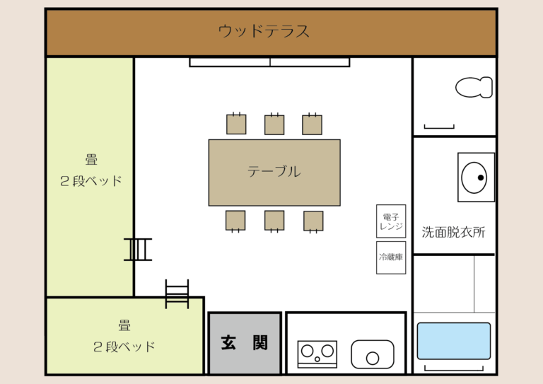 キッチン・風呂・トイレ・テラス、6名分寝具(掛け・敷き・毛布・枕)