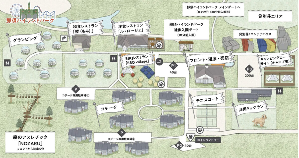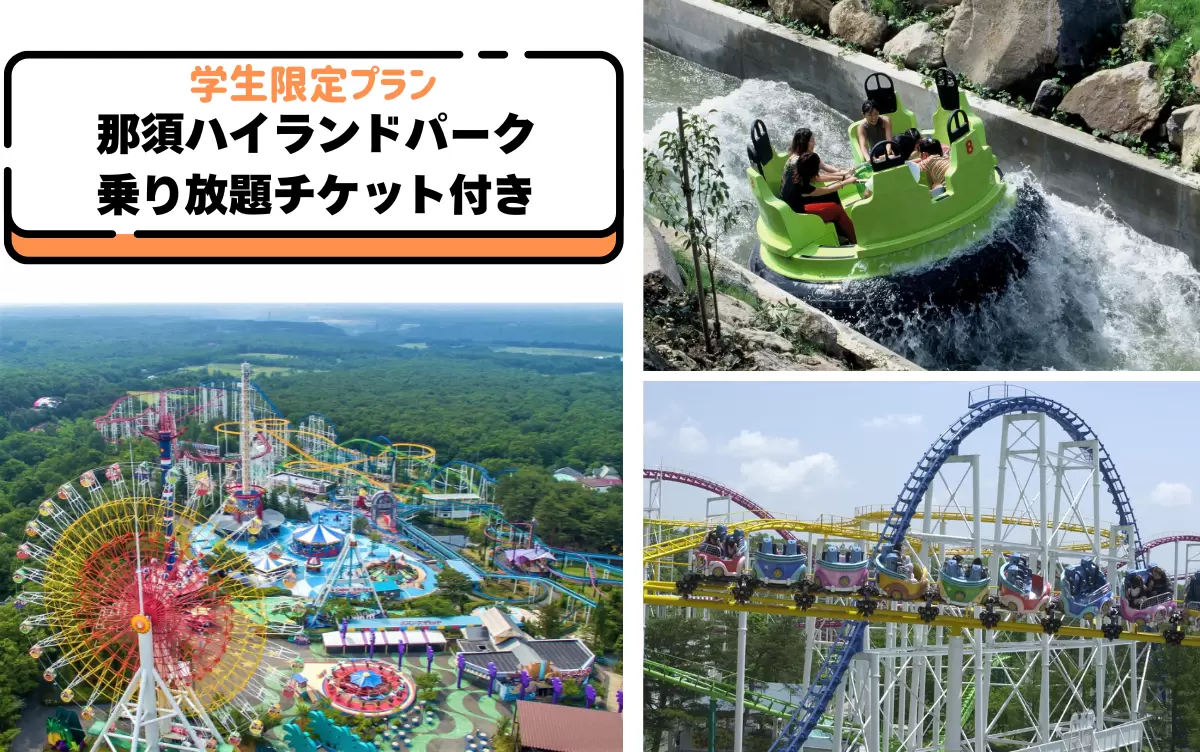 那須ハイランドパークオフィシャルホテル「TOWAピュアコテージ」から徒歩圏内。約40種類のアトラクションがあり、家族や友人、ペットとも一緒に楽しめるテーマパークです。