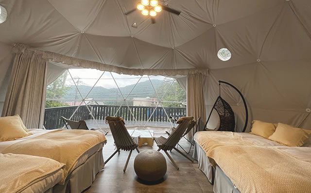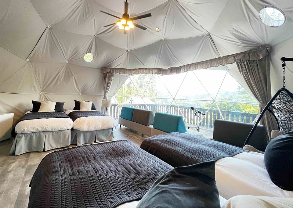玉ねぎ型の直径5mのプレミアムベルテントとシモンズベッドで快適グランピング。