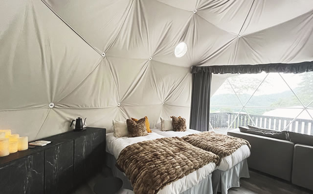 冷暖房完備の北欧製ドームテントで寛ぐラグジュアリードームプランと、広々空間のベル型テントやNordisk製テントに泊まる手ぶらキャンプのプレミアムテントプランの2タイプのお部屋をご用意。