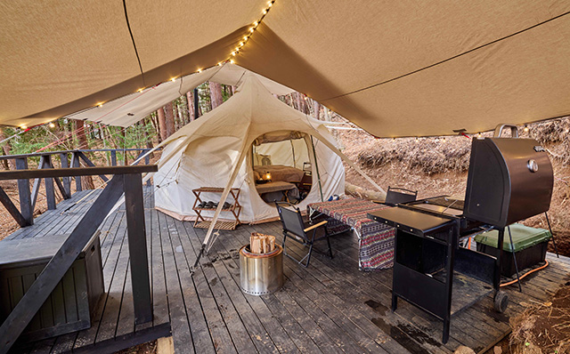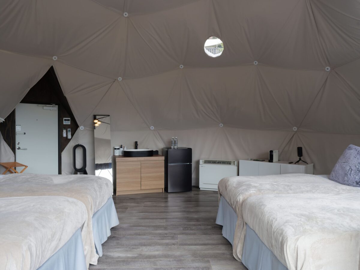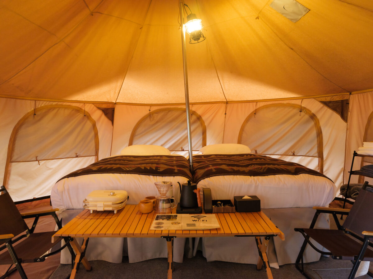 直径3mのプレミアムベルテントとシモンズベッドで快適グランピング。