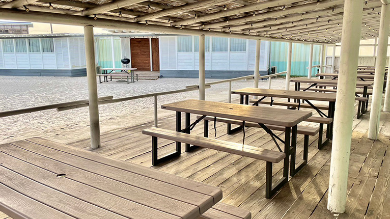 白い砂浜のパノラマを見ながら、ビーチサイドのデッキ上でバーベキューがお楽しみいただけます。