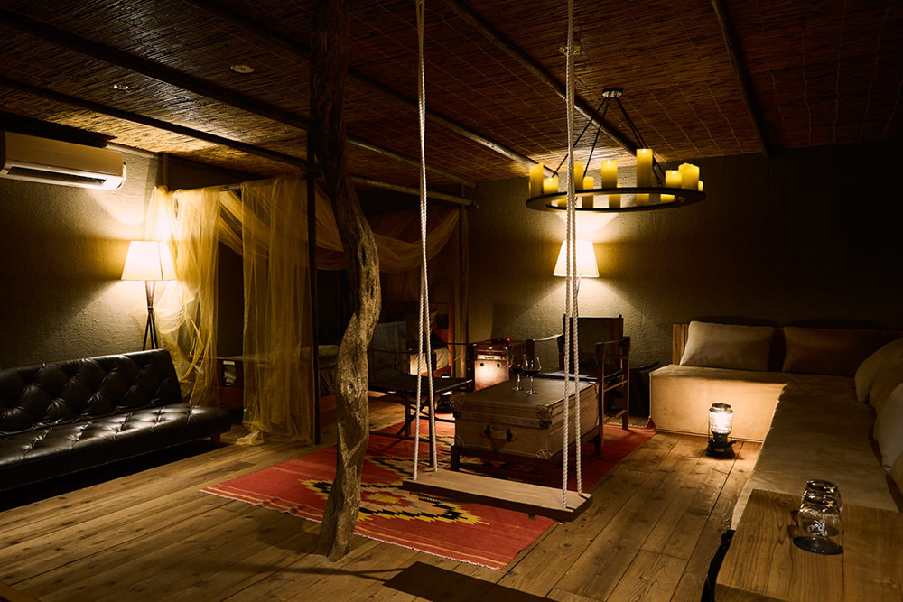 サファリキャンプをテーマにアースカラーやウッド、植栽を多用し、インテリアスイングを設置した空間です。
